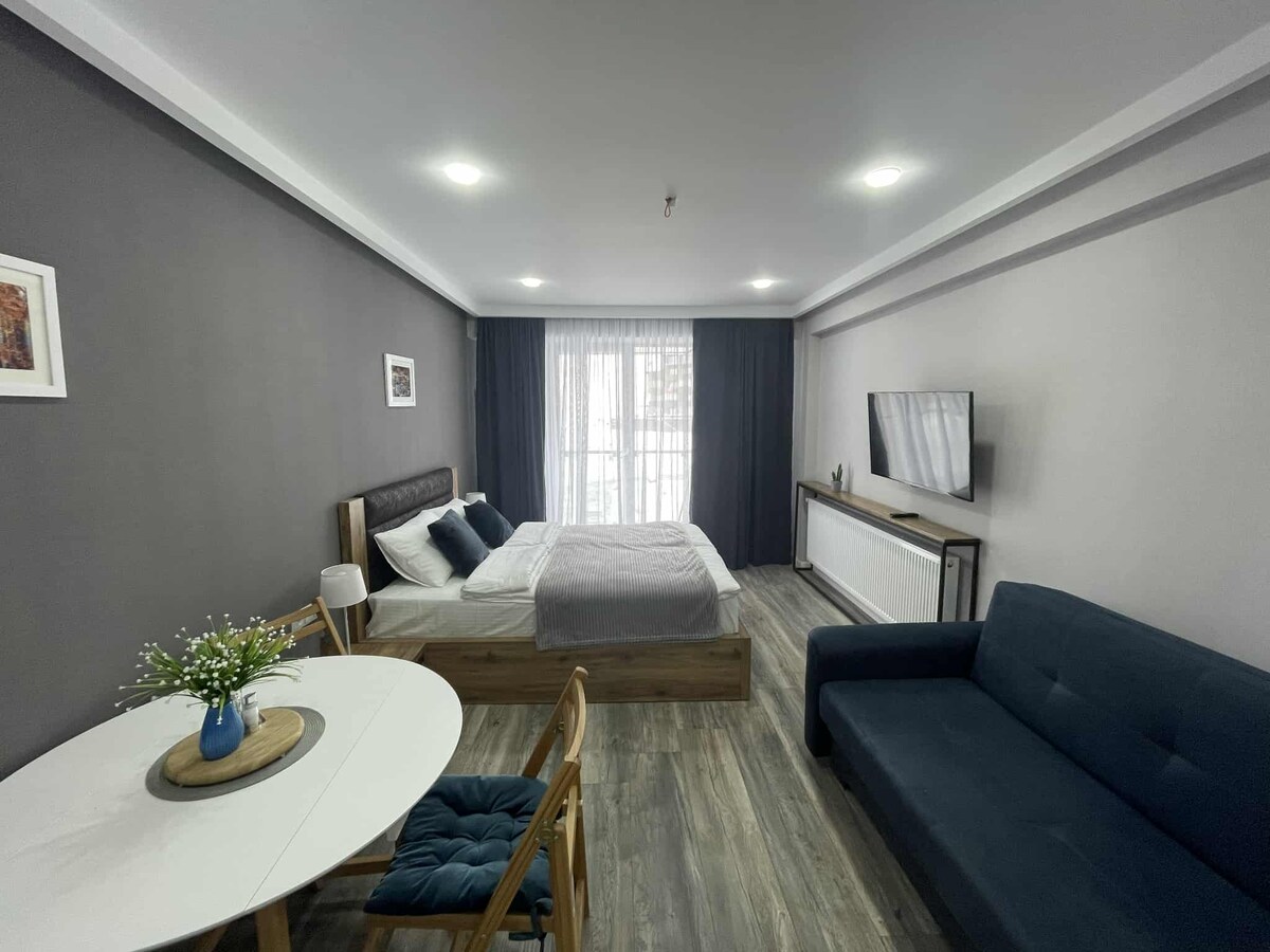 Cari amici, siamo entusiasti di presentarvi il nostro splendido appartamento con una camera da letto di 48 m² a Gori, in Georgia: ci abbiamo messo il cuore e l'anima per progettarlo e renderlo una casa lontano da casa per i nostri ospiti! L'appartamento è situato nel centro di Gori, all'ottavo piano di un nuovo e ricercato complesso residenziale, il Gori Palace, e offre una splendida vista sulla città e sulle colline dal balcone!
