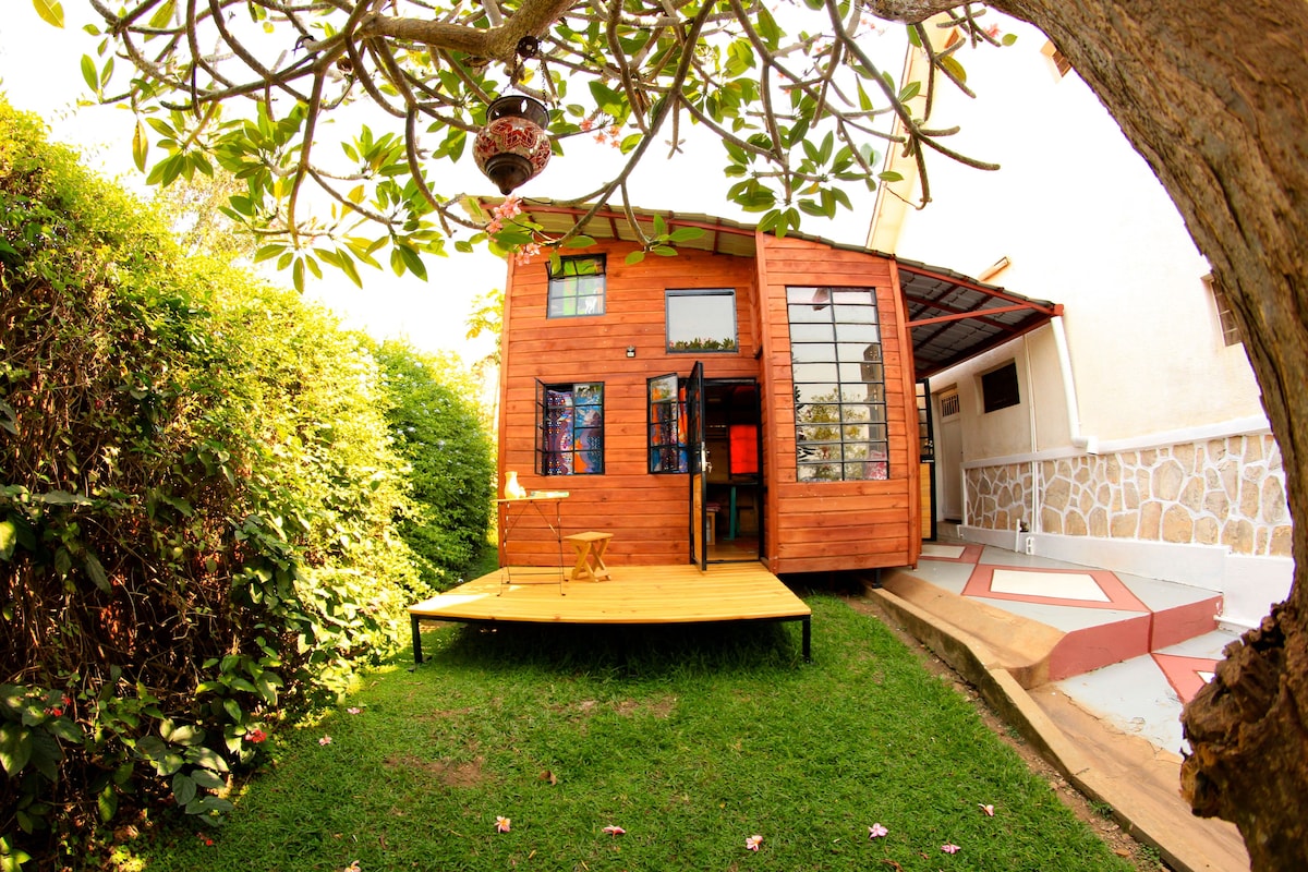 Cabina in legno splendidamente costruita con ingresso indipendente e giardino segreto privato accanto a un famoso caffè a Kigali. Ottima posizione - tranquilla ma centrale - vicino ai collegamenti di autobus e passeggiate a valle.