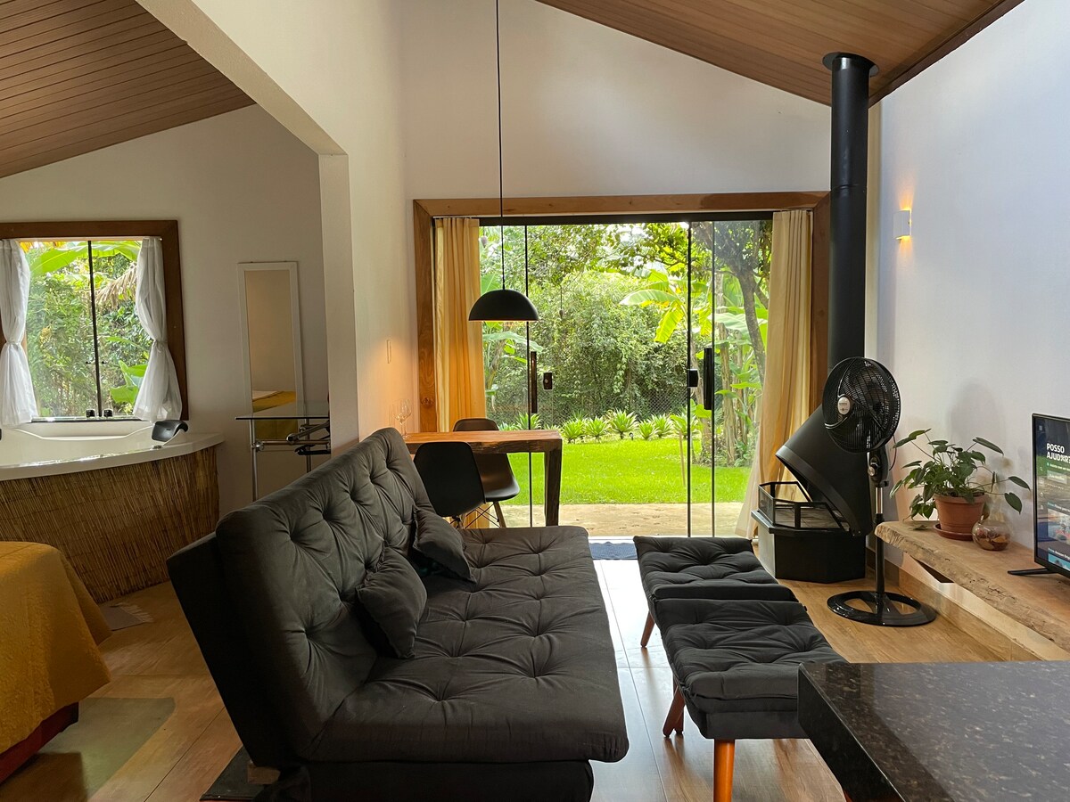 Uno chalet super affascinante con minispa e tutti i comfort e la praticità, oltre a una natura esuberante. Lo spazio è completamente integrato e dispone di 35 m², a 35 km dal centro di BH, con cucina completamente attrezzata, sala da pranzo (home office), soggiorno e letto matrimoniale. I vetri delle porte e delle finestre permettono la contemplazione del giardino anche all'interno della casa, inoltre si possono godere delle varie attrazioni della regione: sentieri, cascate, arrampicata, passeggiate a cavallo, museo Inhotim, eventi gastronomici e altro ancora.