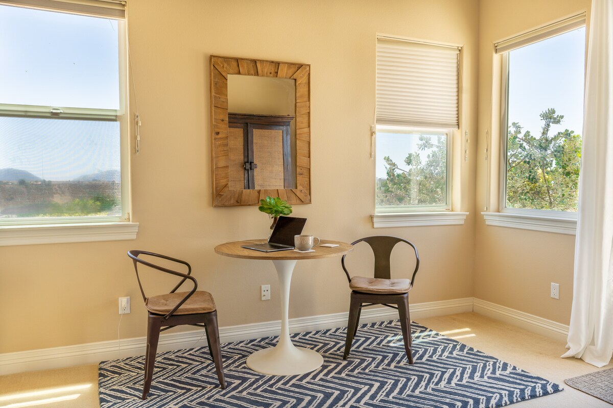 Rilassati in questo splendido monolocale di ispirazione boho sotto le stelle! Il monolocale è stato costruito con cura, con rivestimenti bianchi, soffitti alti e dettagli moderni per un'atmosfera lussuosa e affascinante. Goditi le stelle e la vista sulle montagne dal nostro giardino ispirato a Bali. Il monolocale si trova nella rurale e tranquilla comunità collinare di Rancho Spanish Hills, un ambiente tranquillo e sereno per una vacanza di coppia! Sebbene la struttura sia tranquilla e appartata, alcune delle migliori cantine distano solo 15-20 minuti!