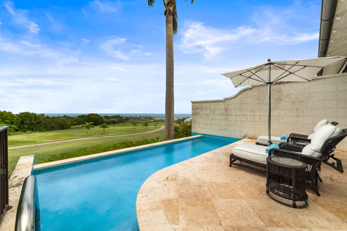 This villa is located in the Garden Wall Area of Apes Hill Golf Club Offering stunning views of the West coast, Golf Course and the Country Club. You will be greeted with spacious living, with a welcoming open plan from the kitchen, dining and living area, easily extended out to the covered patio area. The patio sliding doors are wall to wall and open fully to offer an indoor/outdoor living style. From here you will find the infinity style pool that overlooks the 18th hole.