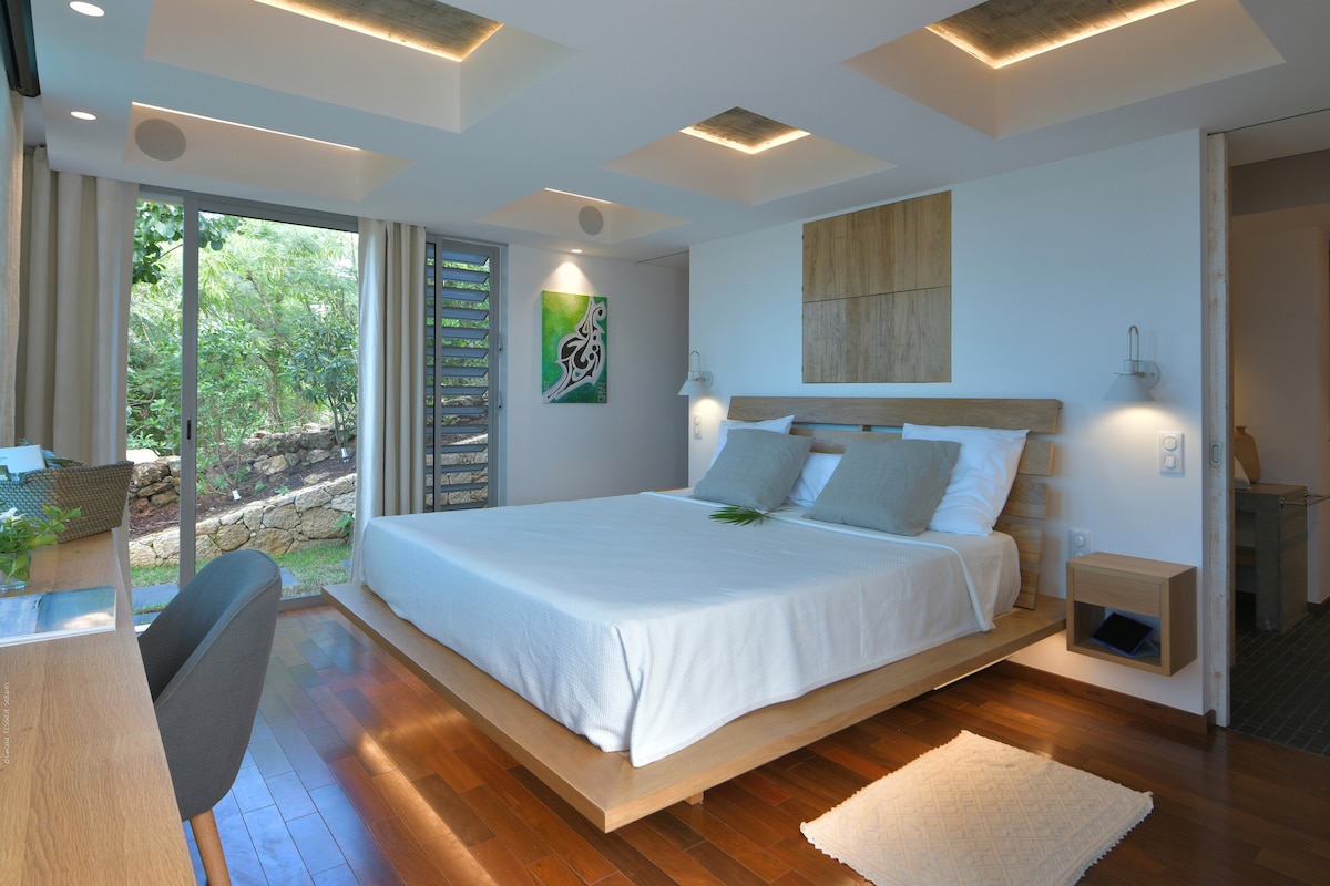 Zanoli est le bungalow situé au rez-de-chaussée de la Villa Nature, avec une vue sur la piscine, l'océan et les ilets à l'horizon.