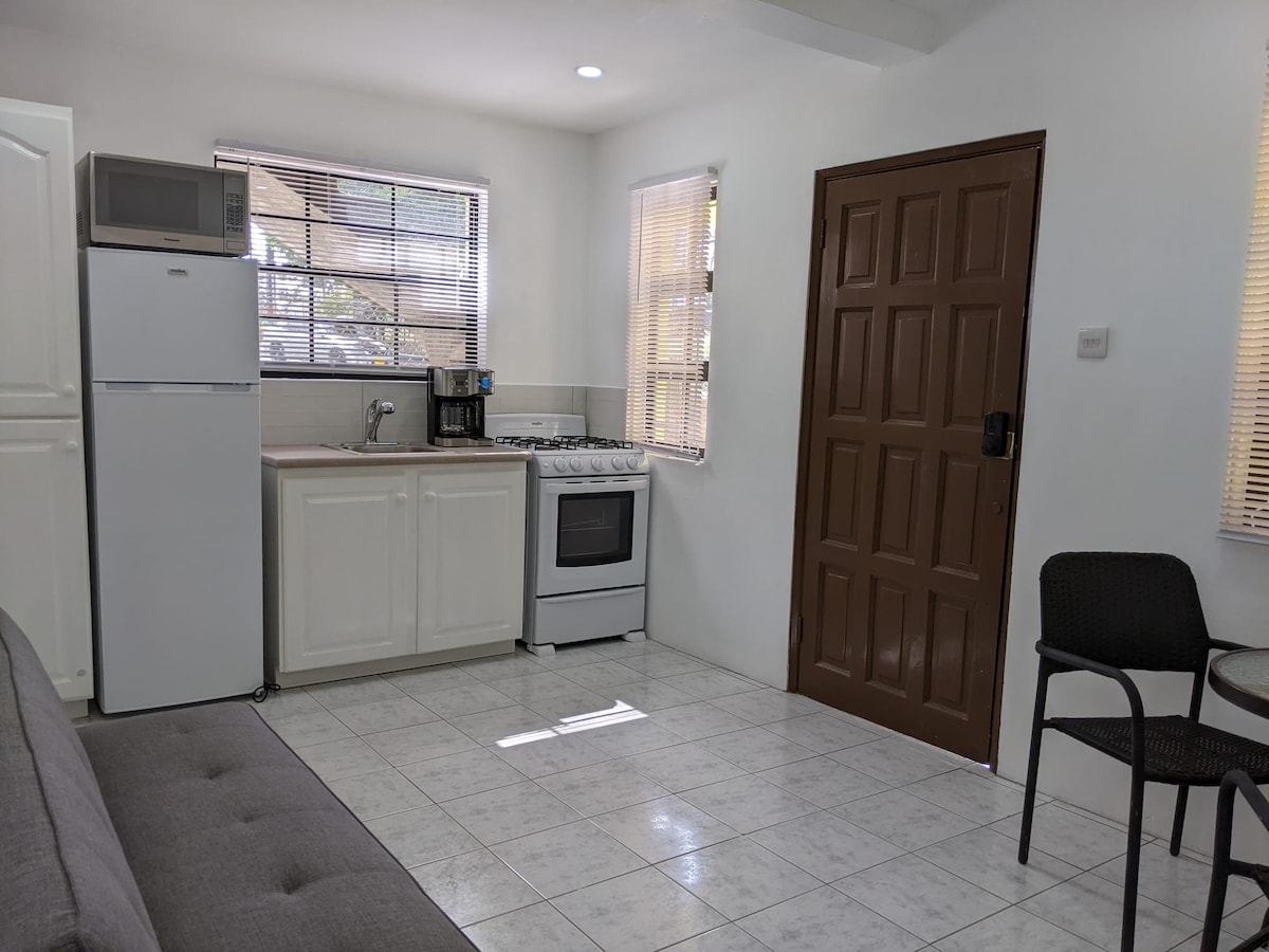 Kaibus Place: rilassati e rilassati in questo spazio di 478 piedi quadrati interamente per la tua comodità. Moderno ma elegante, questo alloggio si trova a Kaibus Place, a circa 150 piedi dall'accesso alla spiaggia di Portici. Completamente autonomo con cucina completa, divano letto, ampio patio esterno, letto queen size, lavasciuga in unità, WIFI dedicato (Unit specific), doccia Rainfall, Two split Unit Aironditioners.