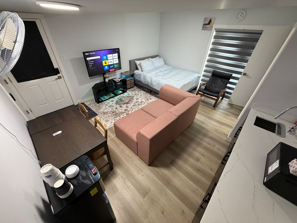 Cerchi un luogo per una vacanza, privato, silenzioso e tranquillo? Appartamento seminterrato con 1 camera da letto e cucina dotata di frigorifero, forno a microonde, bollitore, macchina per il caffè, posate e utensili di base per il tuo uso. La camera è dotata di scrivania e sedia da lettura regolabili, tapis roulant per esercizi e letto matrimoniale caldo e accogliente per un sonno perfetto. Asciugamani puliti sono inclusi. Si trova in un ambiente sereno della città, con un efficiente sistema di autobus.