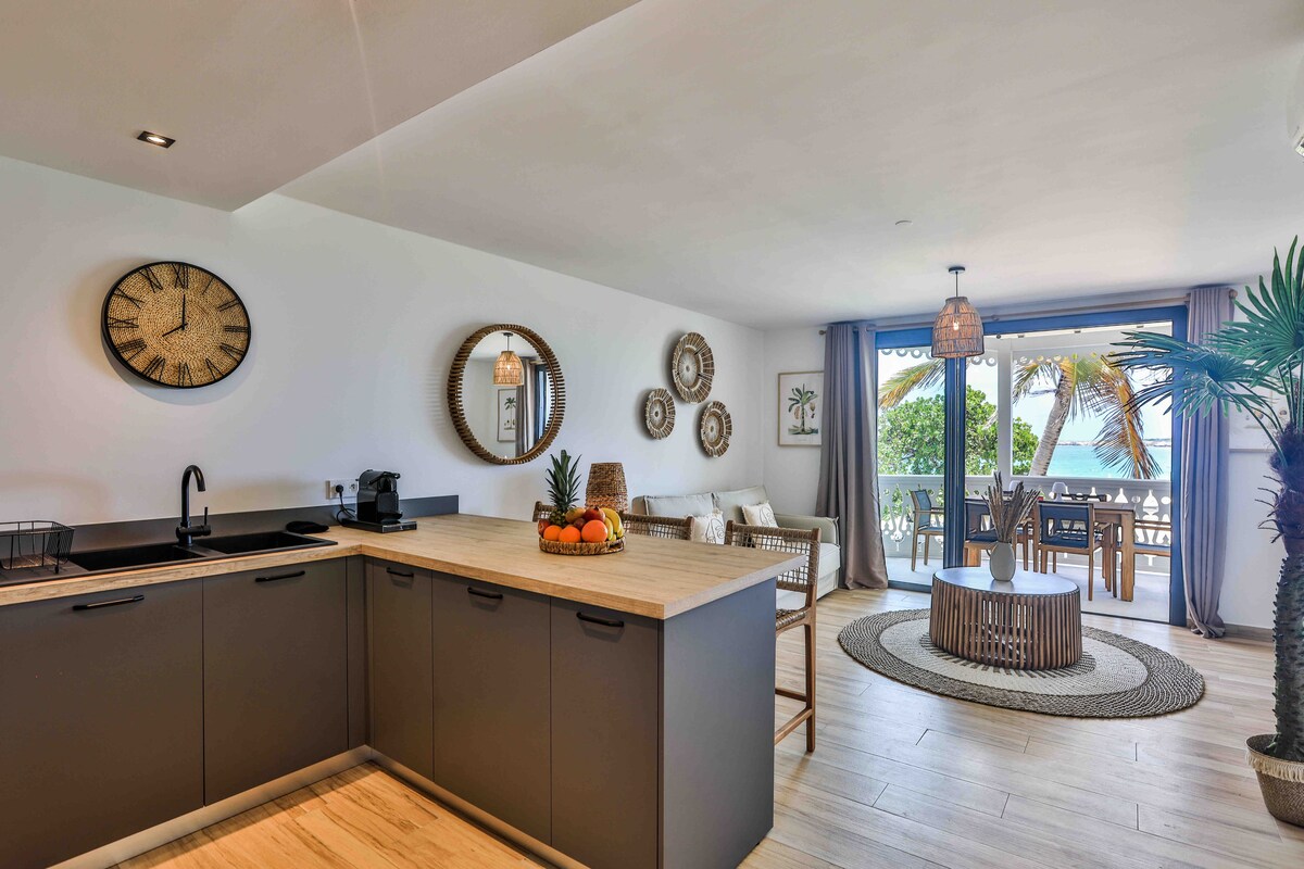 Stunning views of the Caribbean Sea, directly on the beach, overlooking a palm garden and the pool. Carefully decorated and fully equipped villa, air-conditioned, with a water reserve for your comfort. Located in a private, quiet, and secure residence with 4 swimming pools, 2 tennis courts, and private parking. Close to shops, restaurants, bakery, pharmacy, rotisserie, and car rental. Enjoy your meals on a large terrace with an electric awning.
