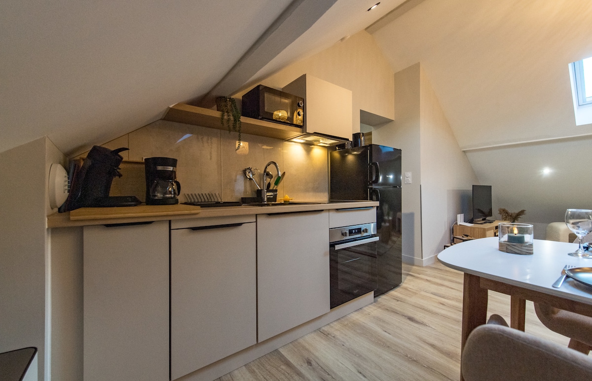 appartamento di 45 m2 situato al 2 ° piano della mia casa, dispone di una camera con 1 letto matrimoniale e un letto singolo, un soggiorno con divano e un divano letto BZ di 140/190,una cucina attrezzata, un bagno le lenzuola, gli asciugamani e le pulizie sono inclusi nel prezzo l'accesso è tramite la tromba delle scale principale , la zona è tranquilla e piacevole a meno di 5 minuti dal centro della città con negozi Un garage per moto e biciclette è disponibile se necessario