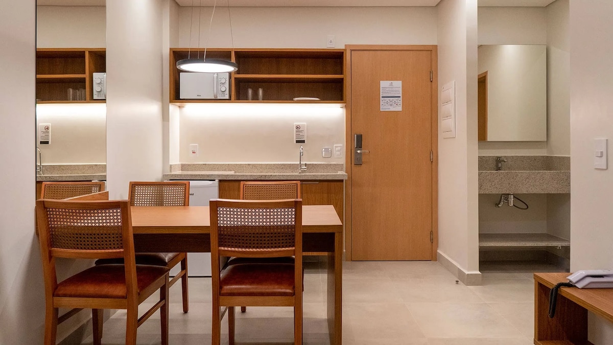 Divertiti con tutta la famiglia in questo luogo pieno di stile. Appartamento smart Appartamento di 30 m² con angolo cottura e soggiorno integrati, soggiorno con divano letto, Smart TV 40" e aria condizionata, cucina con bancone e sgabelli, forno a microonde, frigobar e utensili di base. Camera con letto matrimoniale, Smart TV 40", aria condizionata e balcone. L'appartamento dispone di un bagno, servizi e biancheria completa. Wi-fi gratuito in appartamento e aree comuni. Capacità massima di 4 adulti.