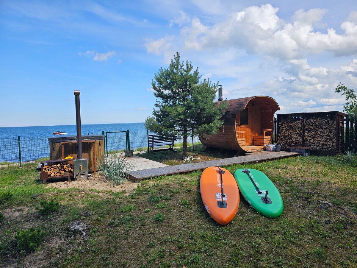 Una casa sulla spiaggia con vista sul mare è progettata per una fuga romantica con tanto spazio (50 m ²). Dalle grandi finestre della casa al mare si può ammirare la vista mare direttamente dal letto. La spiaggia sabbiosa, la vasca idromassaggio e la sauna a tubo sono a soli 40 metri, che offre anche una splendida vista sul mare e sul cielo stellato. Al buio, il giardino offre un'illuminazione accattivante degli alberi. Una casa sulla spiaggia è una casa indipendente che si trova nella stessa proprietà di una casa estiva di famiglia, ma nessuno vive lì durante l'affitto. Entrambe le case sono limitate allo spazio privato.