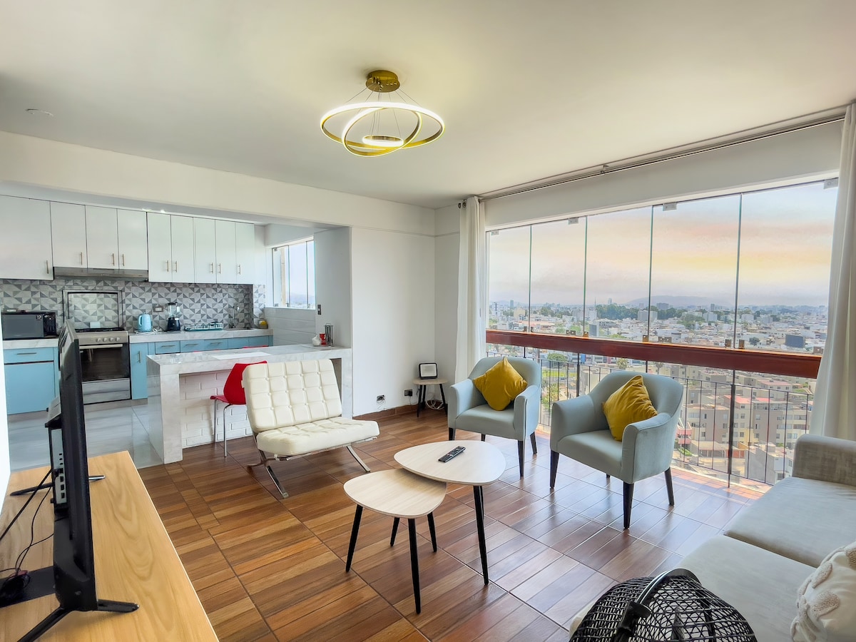 Appartamento moderno e accogliente al 26° piano con vista spettacolare su Javier Prado. Dispone di balcone privato, cucina attrezzata, wifi e arredamento contemporaneo, all'interno di un nuovo edificio con aree comuni come terrazzo, coworking, palestra, lavanderia. Ideale per viaggi di lavoro o di riposo. Vicino a centri commerciali, ristoranti e mezzi di trasporto. Vive Lima dall'alto.