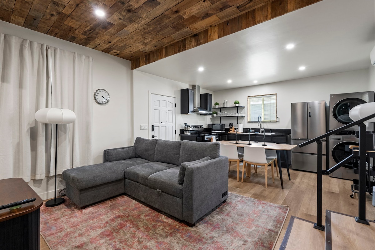 Questa suite in-law è costruita per un soggiorno privato. Self check-in e parcheggio disponibili in strada o nel vialetto su richiesta. Restauro in metallo a tema con un letto Murphy per un sacco di spazio per dormire o rilassarsi con un divanetto e un pouf. Rilassati e goditi una TV da 40 pollici o lavora con una scrivania galleggiante. Inoltre, la suite è dotata di mini frigo e forno a microonde. Doccia a pioggia e piastrelle a cascata accentuano il bagno. L'armadio a muro offre un deposito per i tuoi beni di viaggio.