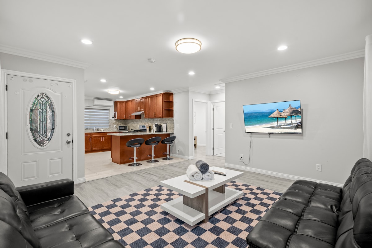 This newly renovated duplex house is in a prime location and features 2 bedroom and 1 bathroom, king-size bed. The house has a full kitchen and a private laundry room, and each room is AC and heated. Speedy WiFi internet. There is also a free parking space available. private entrances with a digital door lock for self-check-in, and it's just a short 15-minute drive to Downtown LA. Quick and easy freeway access is available through 10 & 710 We hire a professional cleaning team to clean the unit.