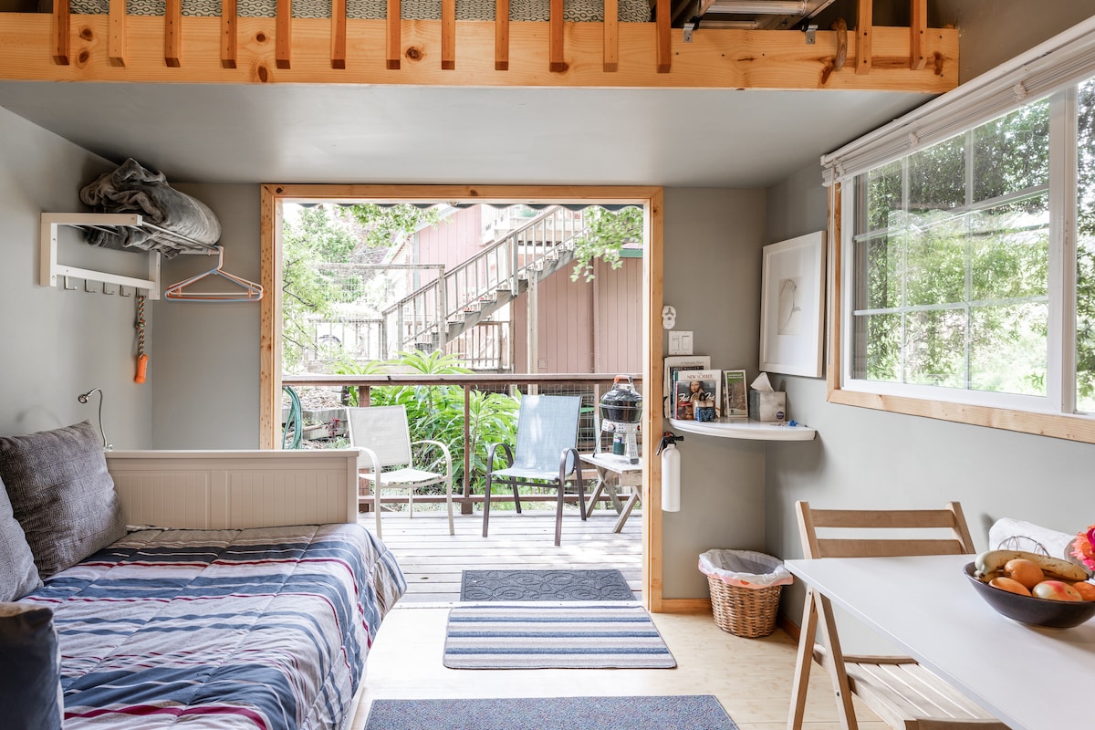 Questo magico rifugio nel giardino è a due passi da San Francisco. Tre camere soleggiate in una stazione ferroviaria del XIX secolo sono situate sopra alberi da frutto e mini prati con una vasca da bagno in stile giapponese per una o due persone. Esci sulla spiaggia, parco, riserva naturale, ristoranti, negozi e caffetterie. Tutto nel raggio di .02 miglia. Prendi l'autobus o la barca per il centro di San Francisco (15-25 minuti) Host affascinanti in loco. Quartiere sicuro e percorribile a piedi. Ricco di arte e quasi privo di Ikea.