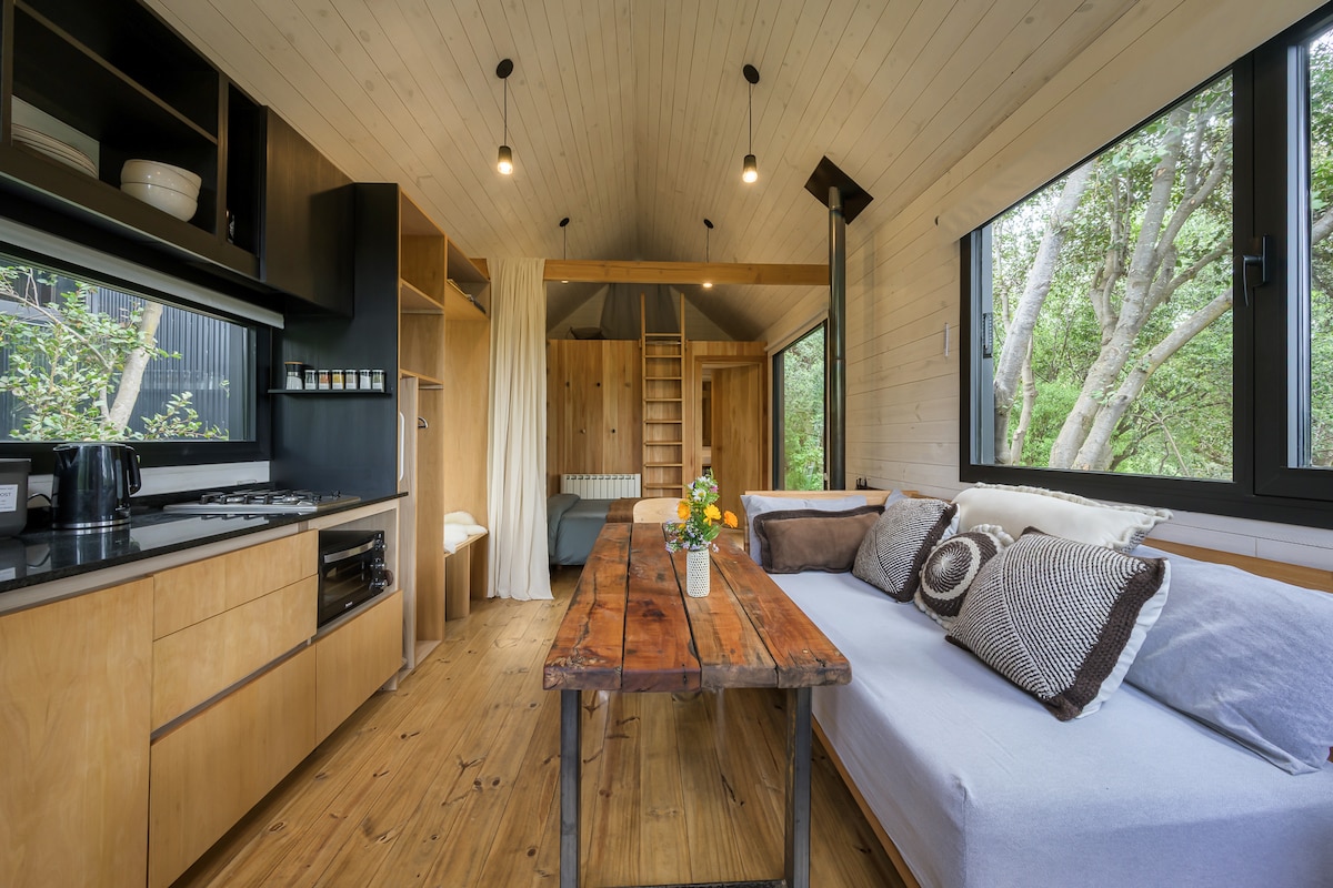 “In a native forest surrounded by mountains, with the Quilquihue River just 100 meters away and Lake Lolog only 300 meters away, you’ll find Encuentro Silvestre in a residential neighborhood, set on a 3,400 m² lot with wide open views. This tiny house on wheels is fully equipped with everything you might need, so you can enjoy an unforgettable vacation—comfortable and connected with the natural paradise around us. On the same property, there are two more 30 m² cabins and my workspace.