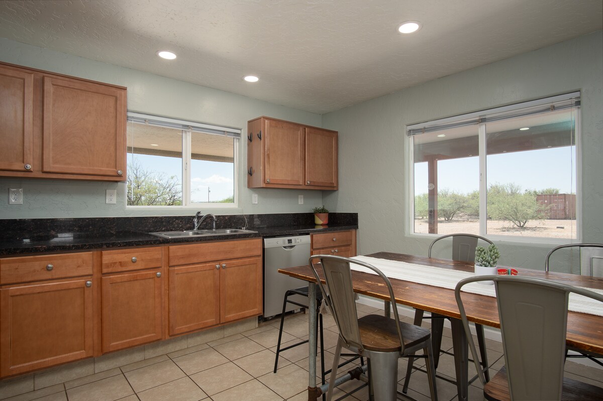 Goditi un soggiorno spazioso e sereno in questa struttura con 3 camere da letto e 2,5 bagni, situata ai piedi delle montagne Huachuca, vicino al confine messicano. Sito perfetto e tranquillo per gli amanti dell'avventura all'aria aperta sulle Huachucas o per chi vuole visitare Bisbee (20 minuti), Sierra Vista (20 minuti) o Tombstone (40 minuti). La casa dispone di una suite padronale con letto king-size, bagno con vasca idromassaggio, due camere da letto aggiuntive con bagno separato e una spaziosa cucina. Goditi la vista e osserva la fauna selvatica dai portici anteriori e posteriori.