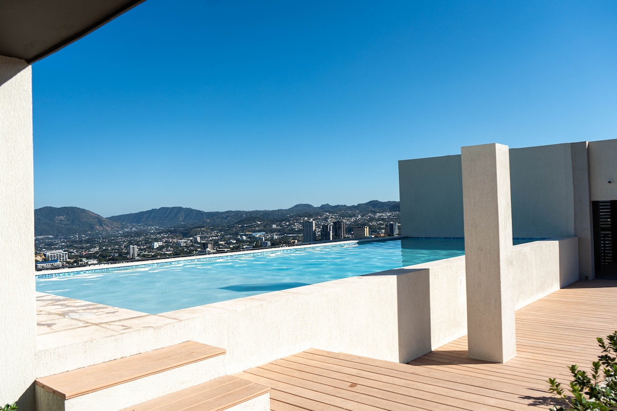 Wake up on the 16th floor with the best volcano view. Enjoy the pool, cinema with projector and Netflix, Disney+, Prime, HBO, fast Wi-Fi, 24/7 security, and free private parking. 2 blocks from the stadium, near the National Library, and 45 min to Surf City.