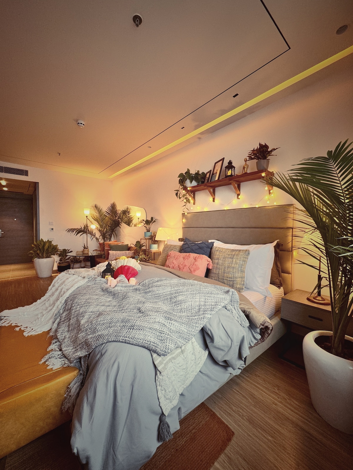 Lush by Lumen Leaf incorona AIPL Joy Square, Sector 63. Le vetrate a tutta altezza rivelano lo skyline di Gurgaon e l'alba sulle colline di Aravalli. Immergiti in un letto king-size con morbidi plaid, luci d'atmosfera, Wi-Fi e Netflix, oppure prepara un caffè alla scrivania. Un elegante angolo cottura, un minibar rifornito e una doccia a pioggia termale ti viziano. Caffè, boutique e un cinema INOX si trovano a 5 minuti di distanza; CyberHub, Golf Course Road e HUDA City Metro sono a soli 12 minuti, perfetti per soggiorni di lavoro, soggiorni o fughe di coppia.