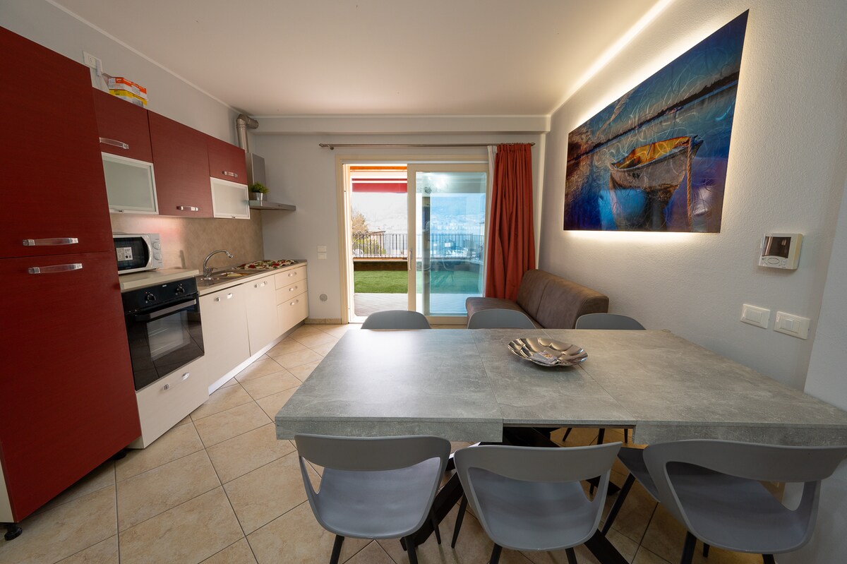 Elegante appartamento a Paratico con giardino privato, patio e garage, situato in residence con piscina. Dispone di 2 camere, bagno moderno e zona giorno con cucina attrezzata e divano letto. Arredi di design, aria condizionata, Wi-Fi e salottino esterno per il relax. Ideale per famiglie o amici, fino a 6 ospiti.