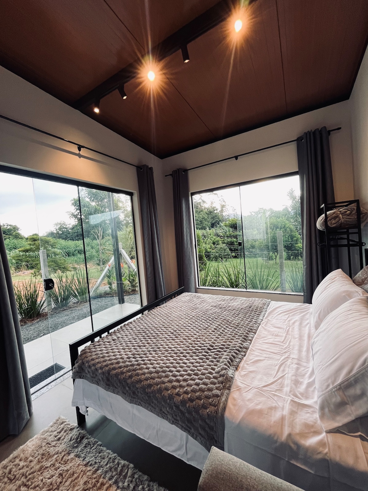 Oferece: cozinha completa e totalmente equipada + Geladeira com filtro de água e gelo; Sala com uma TV de 75"; Área Externa com churrasqueira; Garagem para dois carros; Lavabo; Lavanderia completa; Quarto 1 (Suíte com closet, escrivaninha, sacada, ar condicionado, cama de casal); Quarto 2 (Cama de casal, escrivaninha, guarda-roupa, ar condicionado, vista para a natureza); 01 Banheiro social; Comodidades: Wi-fi; Roupa de cama e banho; Localização: à 10 min do centro; próximo a farmácia e mercado;