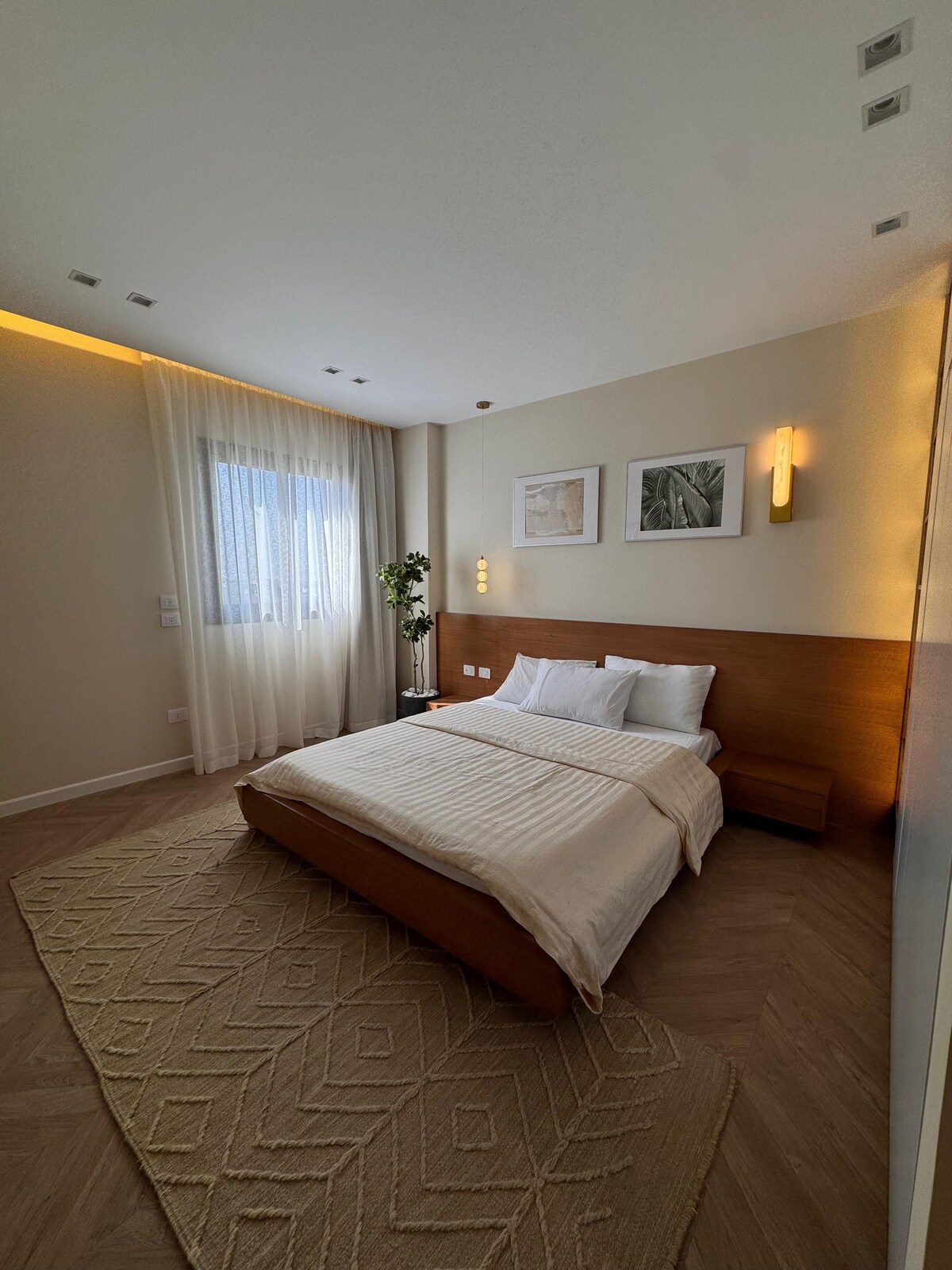 Benvenuto nel tuo luminoso ed elegante rifugio al piano terra a Madinaty! Questo appartamento con una camera da letto completamente arredato dispone di un comodo letto matrimoniale, aria condizionata, cucina completamente attrezzata e Smart TV. Goditi la comodità di ampie strade, sottocomplessi con servizi locali e centri commerciali nelle vicinanze con negozi e ristoranti. Rilassati e distenditi nella vivace comunità con parchi, piscine, parchi giochi e una palestra. La tua vacanza perfetta ti aspetta!