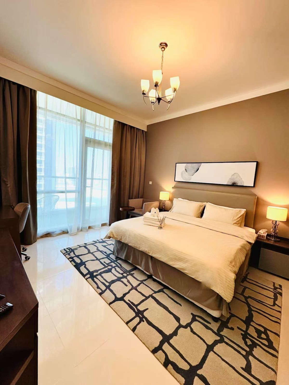Wake up to breathtaking sunsets and skyline views. Located on the 35th floor, this cozy and modern apartment combines warmth, style, and comfort with beautifully designed interiors and thoughtful touches. Located in the city of Manama, this modern space is less than 15 min from exploring the city’s vibrant culture, markets, waterfront cafés, cultural attractions, top restaurants, and lively nightlife. The apartment is above the noise of the city, and is perfect for a peaceful escape!