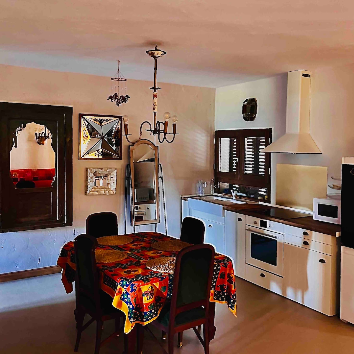Es una casa de invitados situada dentro de la parcela donde esta la casa de los dueños.Consta de 2 habitaciones,salón con cocina americana y baño.El jardín,la barbacoa y la piscina son de uso común de huéspedes y dueños,pero nosotros respetamos la intimidad de nuestros inquilinos.Por motivos de trabajo prácticamente no estamos en casa a lo largo del día.Dentro de la casa NO se puede fumar y NO se aceptan mascotas sin consultar previamente con los dueños