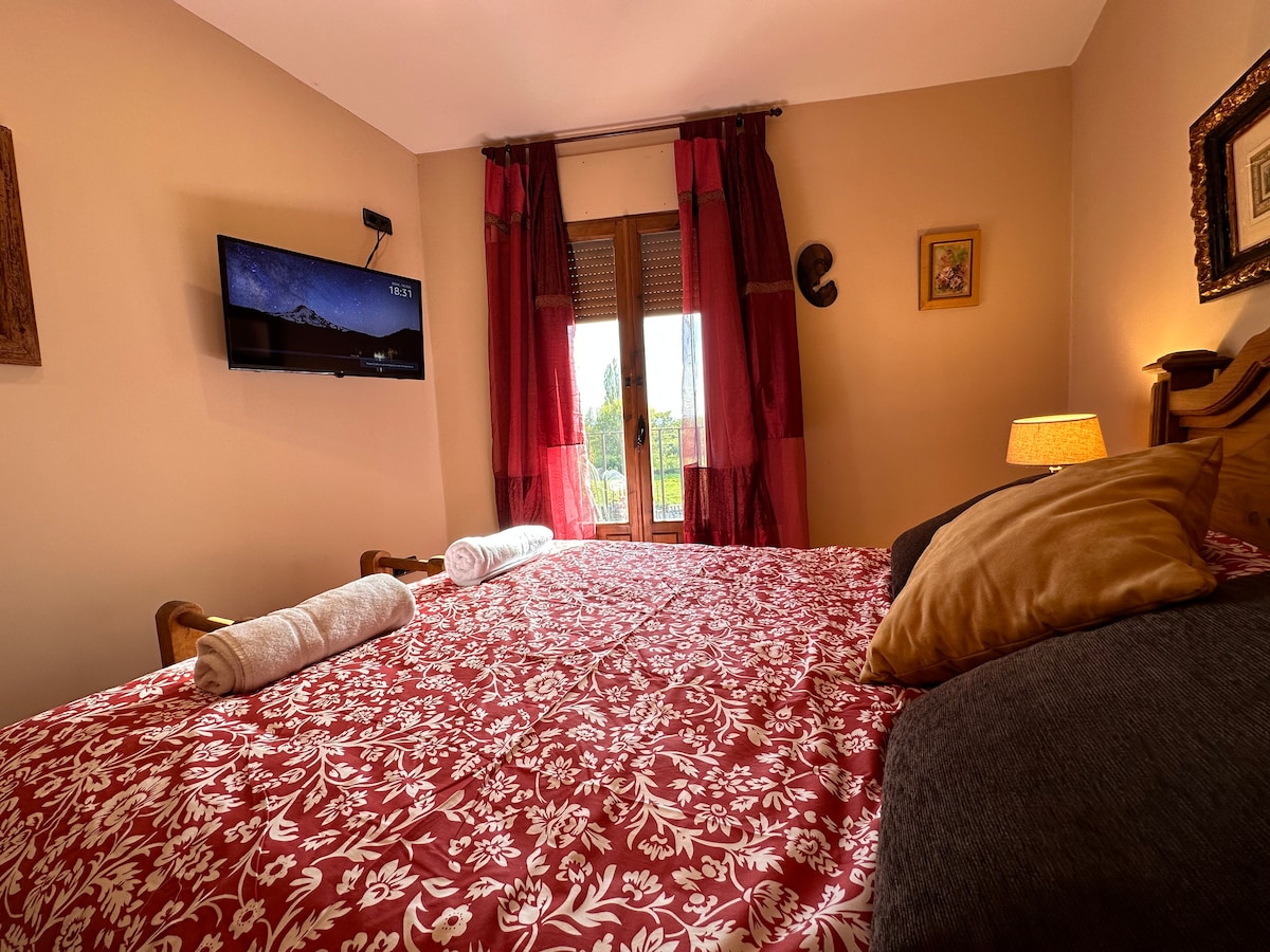 La suite Álamo Negro combina elegancia y confort rural. Dispone de cama doble y cama individual con ropa suave, muebles de madera maciza y detalles tradicionales. Ofrece TV 32” con Netflix y Prime, baño privado con ducha e hidromasaje y toallas suaves. Sus vistas al paisaje completan este refugio tranquilo ideal para descansar tras un día explorando la naturaleza.