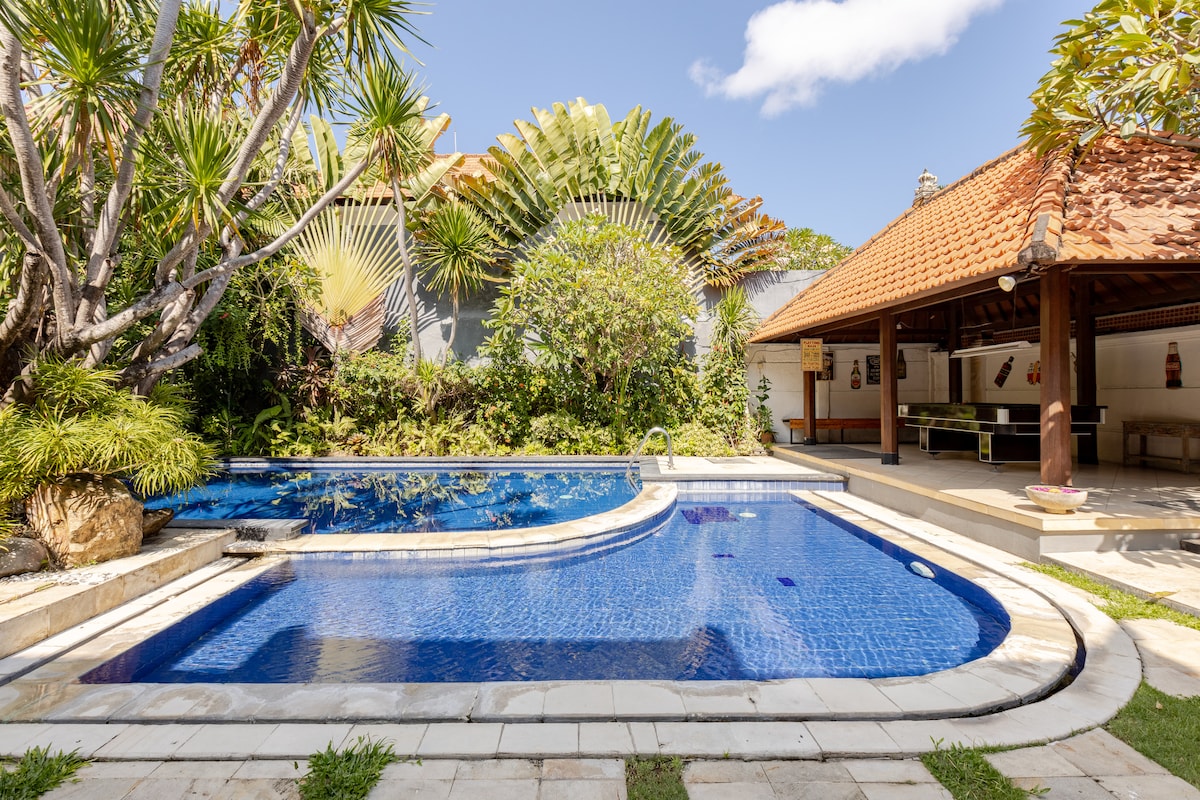 Approfitta del trasferimento aeroportuale incluso in questa nuova villa con personale e completamente climatizzata. Siediti a una colazione calda ogni mattina, insieme al caffè Delonghi. Per l'intrattenimento, accendi le 5 Smart TV con Netflix. * Aria condizionata in tutta la casa, nuovi sistemi split Daikin Inverter * 3 suite principali: letti king-size, Smart TV (canali australiani, AFL, via cavo e Netflix) * 4° camera da letto con 4 letti singoli a castello king-size * 4 bagni privati con asciugamani, articoli da bagno e asciugacapelli * Buona separazione tra le master suite (tutte con cassette di sicurezza) * Prese di corrente universali in tutta la villa * 2 lettori DVD. Sistema audio BOSE * Opzioni per mangiare sia all'interno che all'esterno * I letti a castello sono letti singoli king-size * Sala multimediale/giochi separata (TV da 55'' e oltre 10 giochi da tavolo per bambini e adulti) * iPad Apple a disposizione degli ospiti * Frigorifero grande e frigo bar * Nuova macchina da caffè espresso Delonghi * Distributore di acqua calda/fredda * Bottiglie d'acqua in vetro fornite e rifornite quotidianamente gratuitamente *Enorme gazebo/zona relax esterna con punti di alimentazione/USB e ventilatore a soffitto * Ampio garage coperto * 2 lettini e 2 seggioloni * Recinzione di sicurezza per piscina disponibile e installabile gratuitamente su richiesta * Cancelletti di sicurezza per scale, in alto e in basso * Barbecue (può essere preparato dal personale su richiesta) L'intera villa. Gli alloggi del personale si trovano dietro la villa, a cui accedono dal garage senza disturbare gli ospiti. Hai il privilegio di avere il signor Sukra, la leggenda locale, come manager (e altro personale) in loco tutti i giorni dalle 8:00 alle 16:00 per prepararti la colazione e pulire la villa. È disponibile anche 24 ore su 24, 7 giorni su 7, per le emergenze (tramite cellulare). Sukra ti aiuterà anche per qualsiasi cosa di cui hai bisogno, come il cambio valuta al tasso più basso, i requisiti di trasporto, ecc. È multilingue. Fai surf e snorkeling sulla spiaggia di Seminyak, a soli 750 metri da questa posizione tranquilla ed esclusiva. Il centro commerciale Seminyak Village si trova a meno della metà della distanza, mentre i numerosi bar, caffetterie e ristoranti di Eat Street sono facilmente raggiungibili. La villa dispone di un ampio parcheggio per un'auto e diverse moto. Una breve passeggiata lungo il vicolo fino alla strada principale (Jl Braban), che corre dietro "Eats Street" (Jalan Laksamana), è un'opzione semplice per fermare un taxi blu. Un'opzione più economica e facile è scaricare l'app "Grab taxi" e chiamare un taxi fino alla porta d'ingresso della villa. Il signor Sukra, il manager della villa, sarà lieto di aiutarti a organizzare qualsiasi esigenza di trasporto. Su richiesta, è disponibile una tata molto affidabile e sollecita.