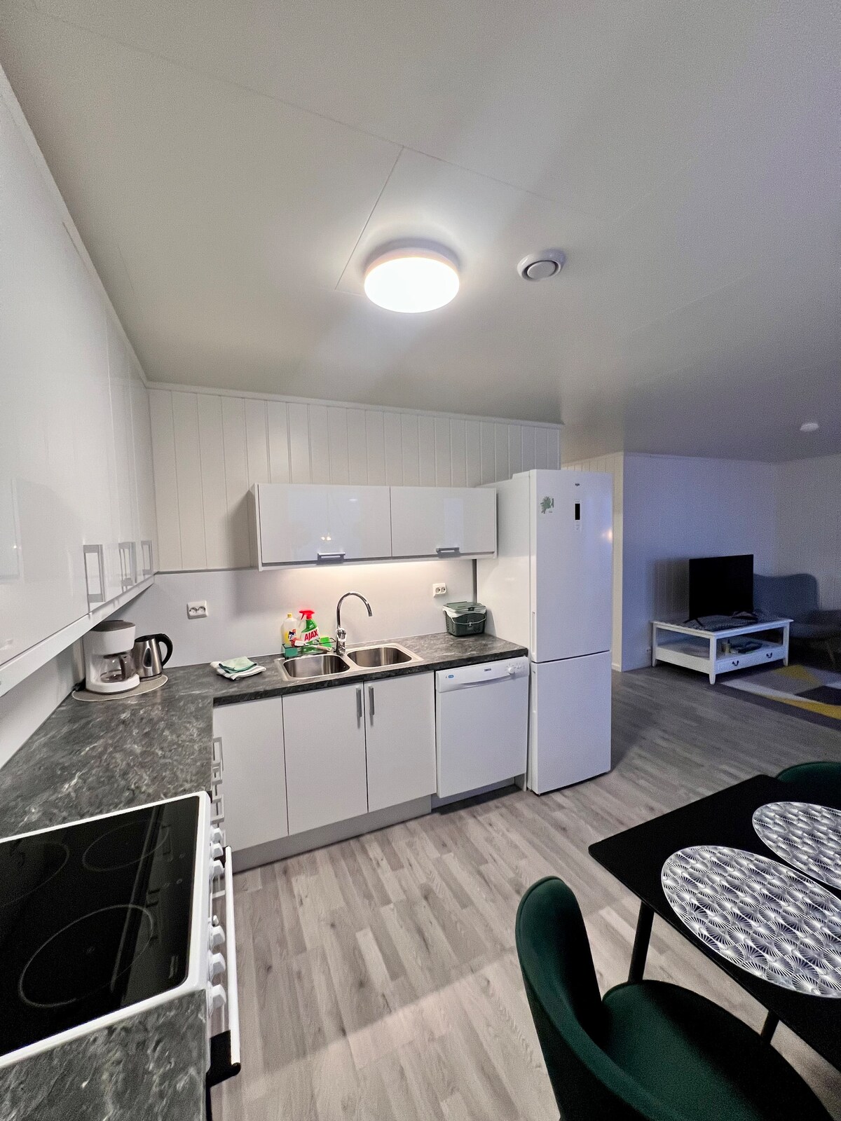 From this residence you have easy access to everything. It is within walking distance to the grocery store and library. The building has a new fitness center and a fantastic cozy cafe/restaurant. If you want access to hiking trails, the beach, frisbee golf course, go-karting, playing beach volleyball or soccer - there are facilities available nearby - most of them right outside the door. From the terrace you can enjoy the midnight sun in summer and the northern lights in winter.