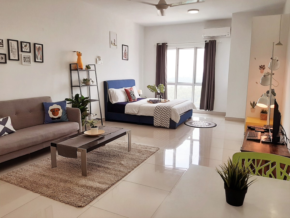 A cosy duplex on the highest floor of the building (Level 21), with a queen bed and a 3-seater sofa. Suitable for both short- and long-term stays. The building is in De Centrum Mall, with shops such as Super7 (supermarket), Mr. DIY, Watsons, and 7-Eleven among others, and facilities like launderettes and a clinic (Poliklinik MyMedik). •Check in time: from 3PM •Check out time: 12PM