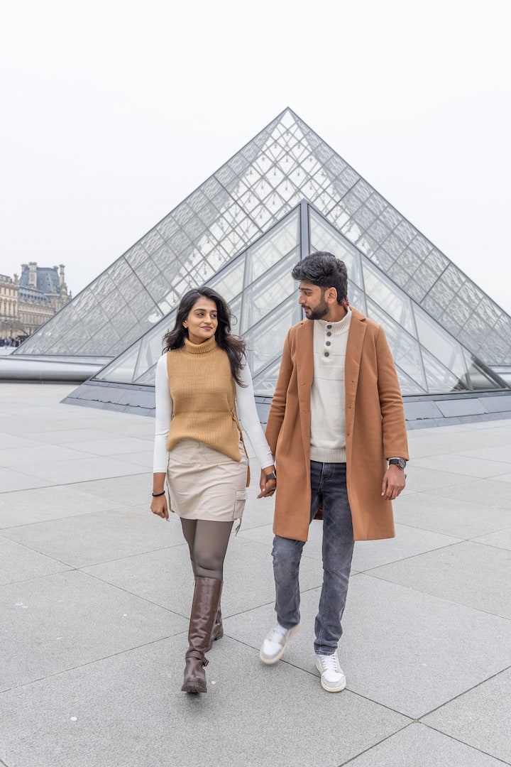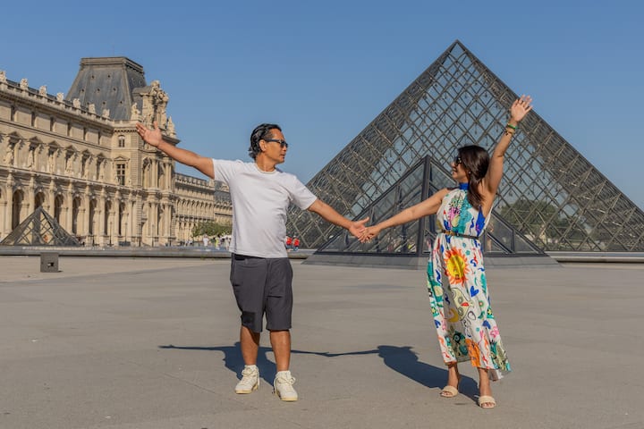 Sessione fotografica di mezz 'ora nell'area del Louvre e del Palais Royal, incentrata su angolazioni e composizioni uniche. Ricevi tutte le foto leggermente modificate entro 2 giorni.