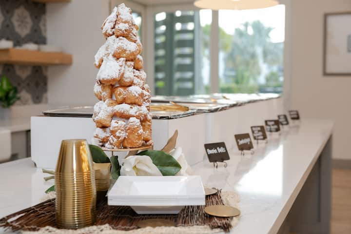 Gli ospiti si servono da un buffet ben organizzato con una varietà di piatti cajun. Questa configurazione offre flessibilità e varietà, perfetta per qualsiasi tipo di incontro.