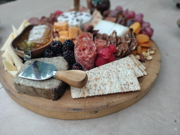 Taglieri artigianali di salumi con formaggi succulenti, salumi stagionati europei, frutta, noci e patatine