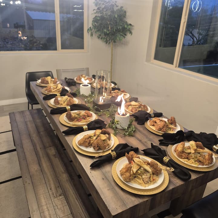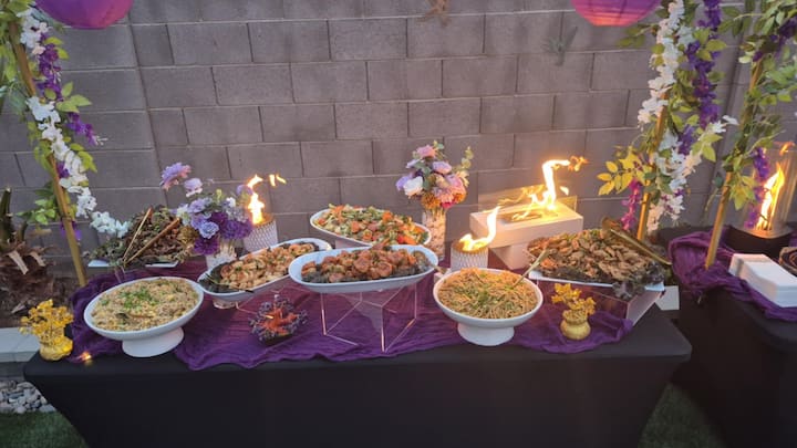 Per questa opzione self-service, faremo un allestimento elaborato con fuoco, fumo, decorazioni, ecc. Abbastanza personalizzabile con combinazioni di colori e temi. Sono inclusi 5 piatti, 1 dessert e bevande analcoliche.