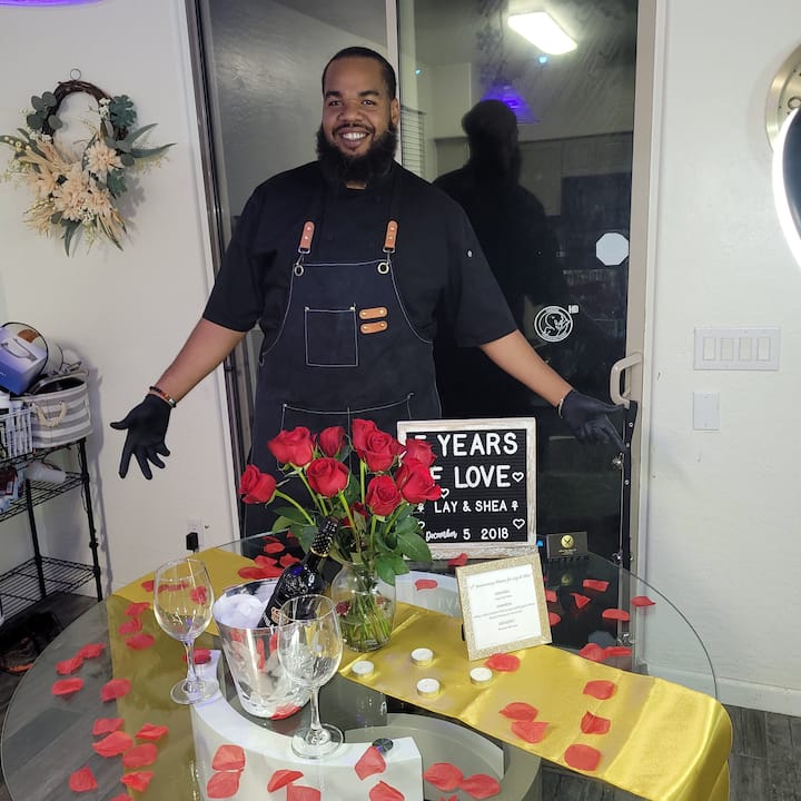 Il mio pacchetto serata romantica è un pasto di 3 portate (surf n turf o a scelta) che include vino (o cocktail) per la cena, un tavolo apparecchiato a lume di candela per 2 e una bacheca.