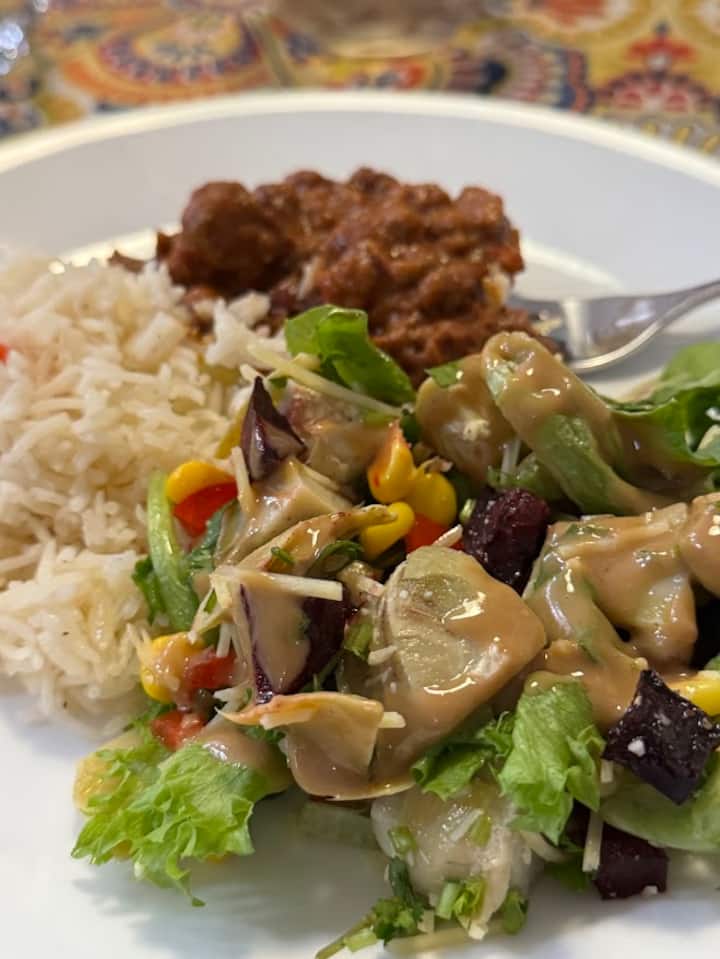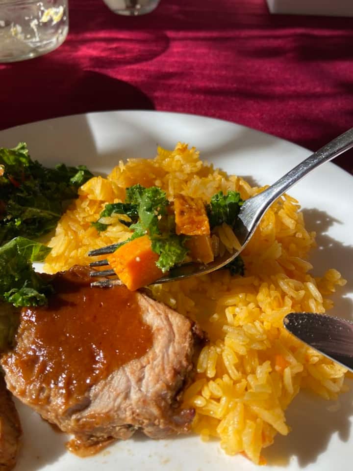 A scelta tra pollo al mojo, stufato di manzo, pernil o ceci al curry. Servito con riso basmati, fagioli neri, insalata di cavolfiore o insalata di rucola. Tres leches per dessert.