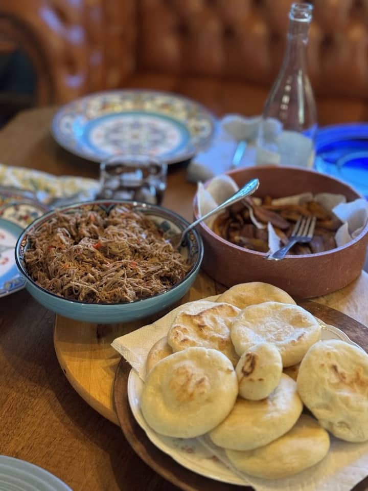 Le arepas venezuelane sono senza glutine e sono servite con carne di manzo, pollo, formaggio o fagioli neri. Servite con platano dolce, insalata di cavolo e le nostre salse.