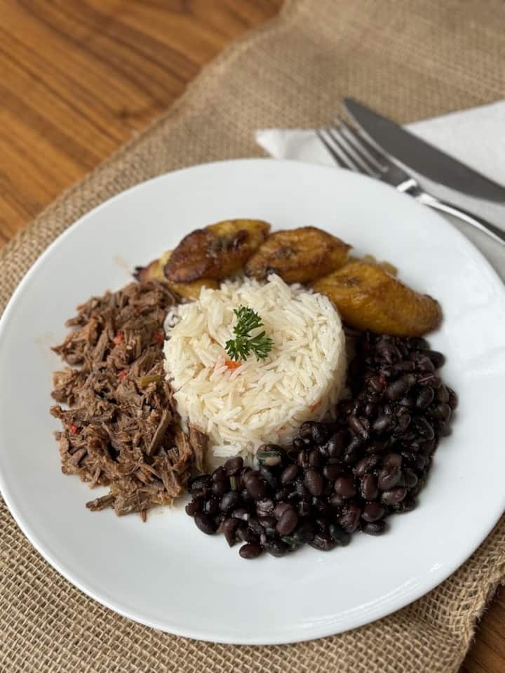 Un classico piatto venezuelano: stufato di manzo sminuzzato, riso basmati con verdure, fagioli neri stufati e platani dolci al forno.
