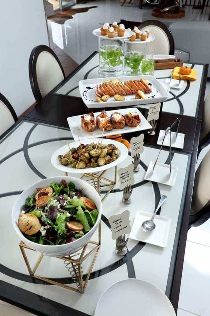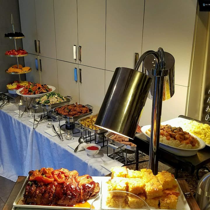 I gruppi di 25 o più persone possono gustare un buffet completo con insalate calde e fredde, 2 opzioni proteiche (ad esempio salmone scottato in padella, gamberi tigre, petto di pollo, costolette di manzo brasate o costolette di agnello) e contorni caldi (ad esempio patate all'aglio, orzo ai funghi selvatici).