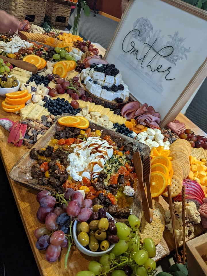 Intrattieni tutto il tuo gruppo con una varietà di prelibatezze su un elegante tavolo da pasto, con una selezione di salumi, formaggi stagionati e freschi di alta qualità, carni, frutta di stagione, crudité, salse e creme spalmabili, e un assortimento di pane, cracker artigianali e crostini.