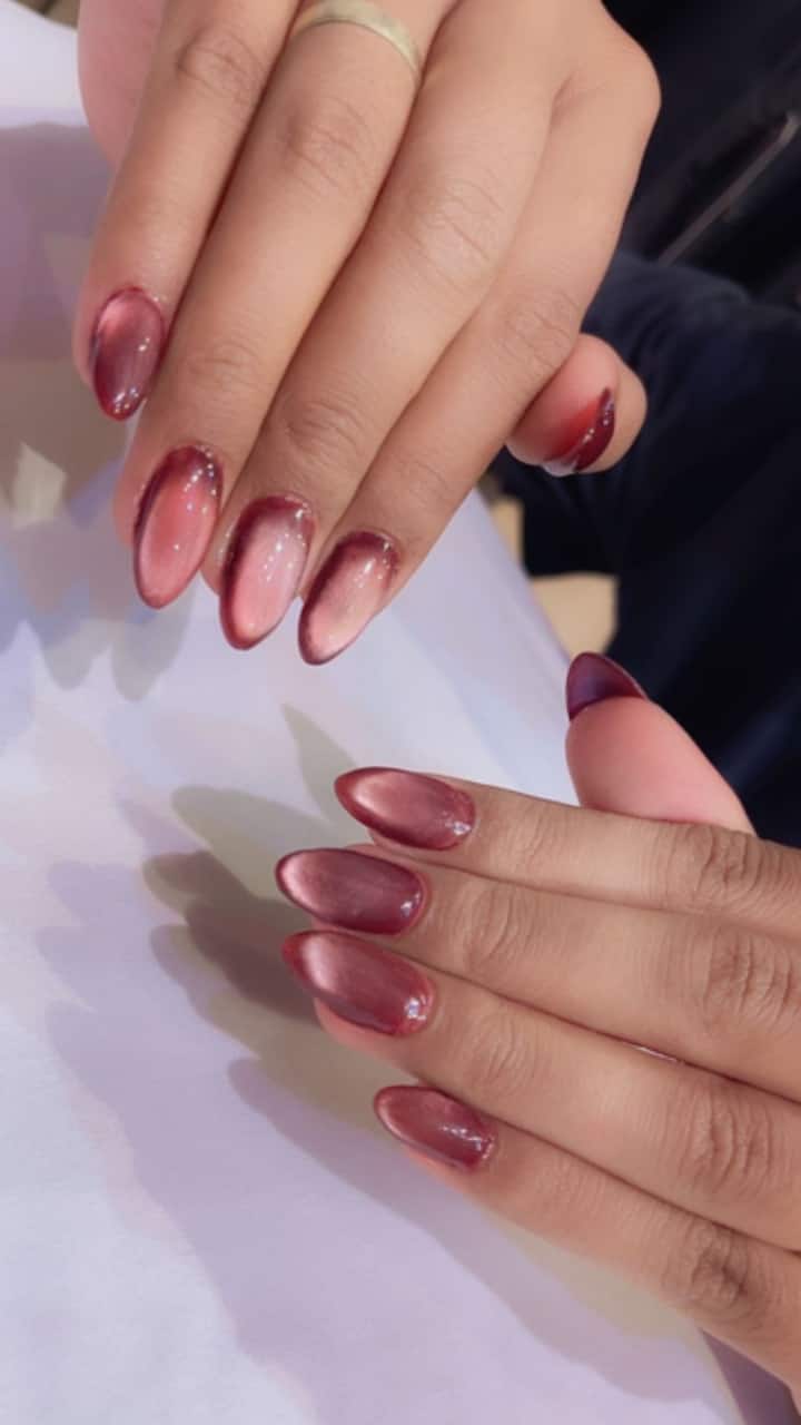 Un design sfumato dal marrone al nudo con una finitura lucida e sottili dettagli glitterati. La forma a mandorla crea un look elegante, femminile e moderno, perfetto per un aspetto lussuoso ma al tempo stesso morbido e naturale.