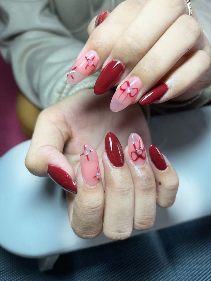 Goditi l'elegante gel nail art caratterizzata da una combinazione di rosso marrone lucido e rosa traslucido, accentuata da dettagli femminili a fiocco e delicati abbellimenti di perle. Un look dolce ma di classe, perfetto per momenti speciali o per il lusso di tutti i giorni.