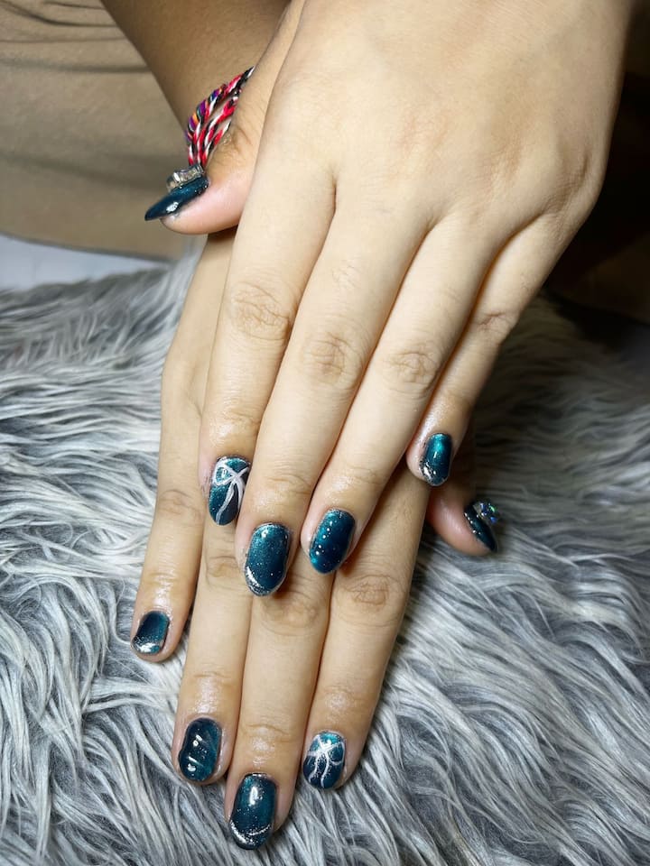Nail art effetto occhi di gatto in una tonalità verde acqua intenso con un effetto magnetico e brillante, impreziosita da linee bianche artistiche e da una delicata brillantezza per un look moderno, elegante e lussuoso.