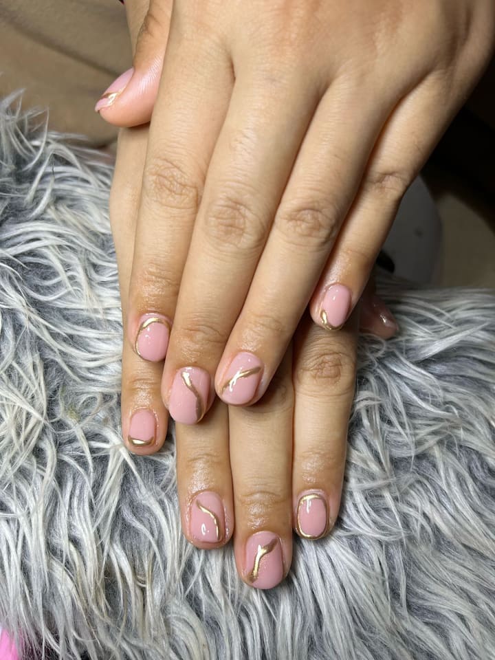 Unghie in gel minimaliste in una morbida tonalità rosa-nude, impreziosite da delicati dettagli dorati per un look pulito, elegante e moderno, perfetto per l'uso quotidiano o per un lusso discreto.