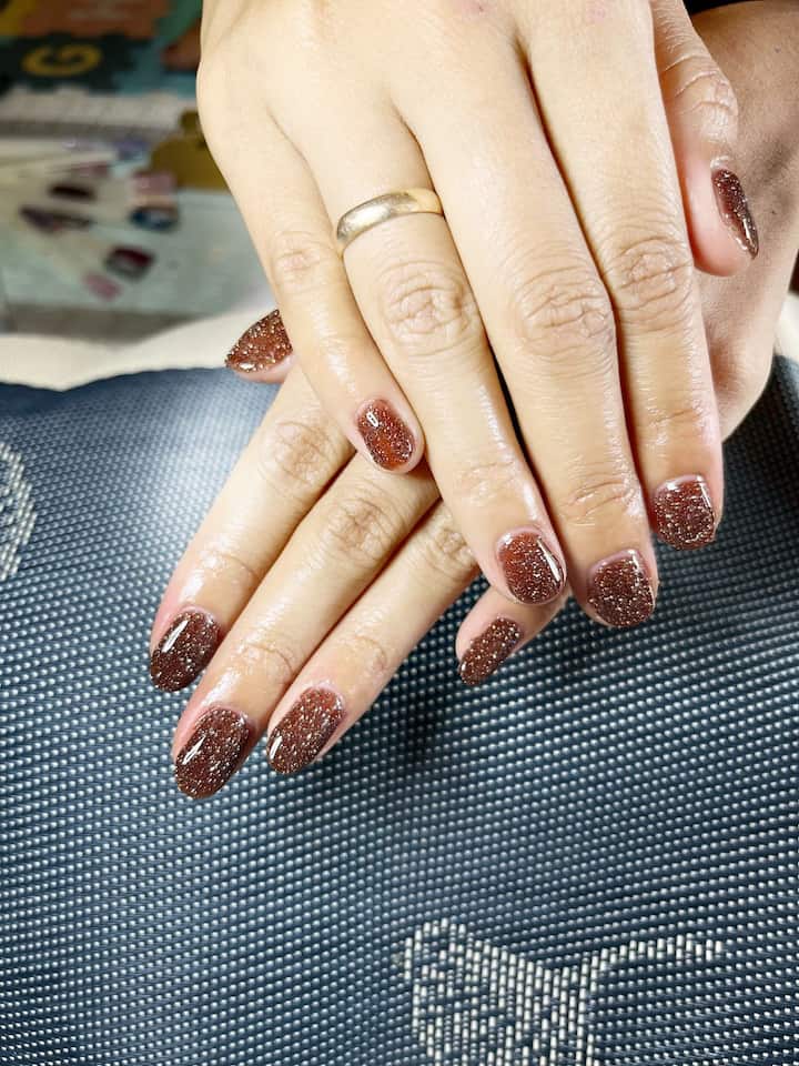 Unghie in gel semplici ed eleganti in una tonalità marrone scintillante e glitterata, che creano un look caldo, ordinato e lussuoso, perfetto per l'uso quotidiano o per le occasioni speciali.