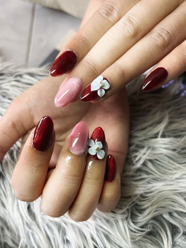 Eleganti unghie in gel con un ricco luccichio rosso vino abbinato a morbidi accenti rosa cipria, evidenziati da delicati dettagli floreali 3D bianchi. Un design femminile e lussuoso, perfetto per occasioni speciali o look romantici.