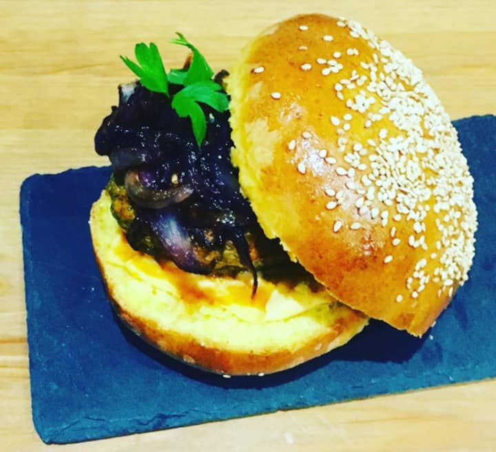 Gustosi Mini burger di pollo speziato, cheddar e cipolla rossa