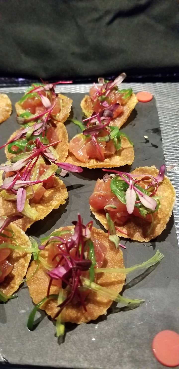 Offriamo piccole porzioni di antipasti come pancetta di maiale, mini hamburger, mini poke di tonno ahi su un chip di wonton, bocconcini di maccheroni al formaggio, bocconcini di spinaci e molto altro ancora.