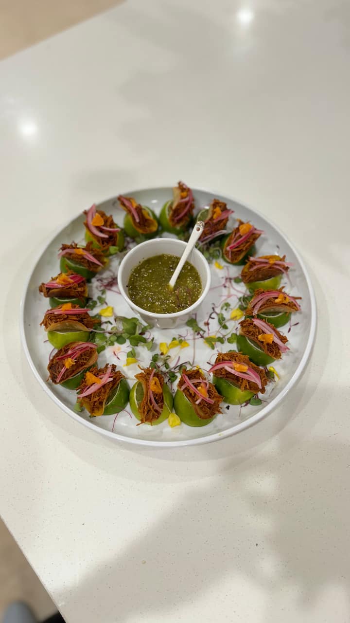 Questa selezione di stuzzichini e una varietà di tacos di ispirazione messicana è pensata per un servizio di consegna facile, che consente agli ospiti di socializzare, fare uno spuntino e godersi sapori audaci e vivaci durante l'evento. Il menu propone un assortimento curato di tacos, guacamole fresco ed eleganti antipasti messicani facili da mangiare e ben equilibrati. Perfetto per un'atmosfera rilassata e conviviale, dove gli ospiti possono gustare ottimo cibo senza interrompere il flusso della serata.