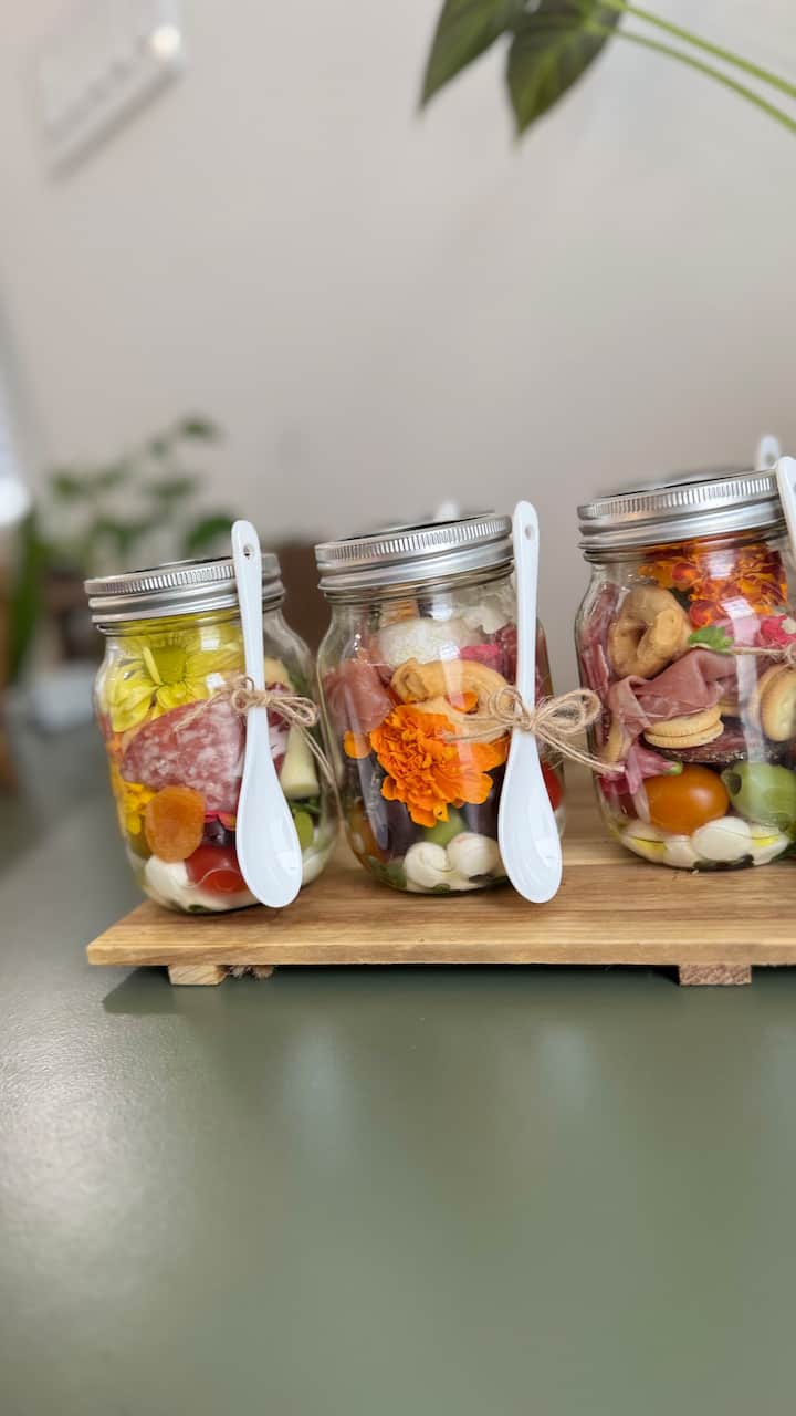 Questa selezione di salumi e piccoli spuntini ispirata alle tapas è pensata per un facile servizio di consegna e un rilassante pasto sociale. Il banchetto presenta una varietà di articoli condivisibili e di piccole dimensioni abbinati a formaggi artigianali e salumi, incoraggiando gli ospiti ad assaggiare, mescolare e gustare al proprio ritmo. Sapore deciso, accessibile e ben presentato, ideale per un incontro rilassato ma di alto livello.