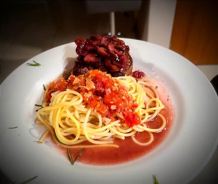 Questa cucina creativa include una selezione di antipasti con una scelta di 4 opzioni. Il piatto principale offre una varietà di prelibatezze, come gamberi, manzo alla Stroganoff e anatra all'arancia. Concludi con dolci che combinano sapori intensi e delicati.